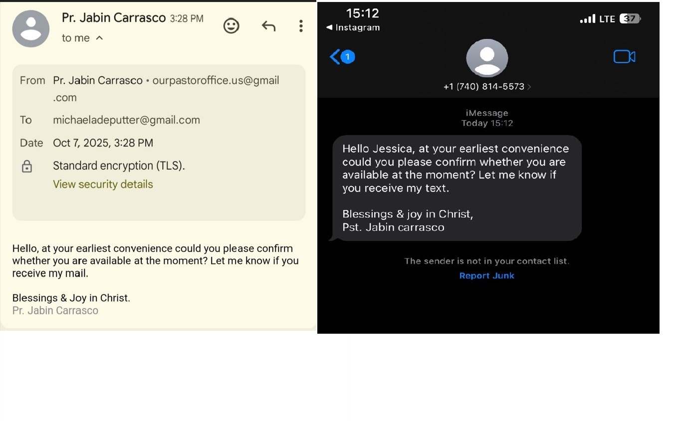 Please be advised that there are fraudulent text messages and emails being sent out claiming to be from Pastor Jabin. These are scams. For your safety, do not click on any links, call any numbers, or reply to these messages.